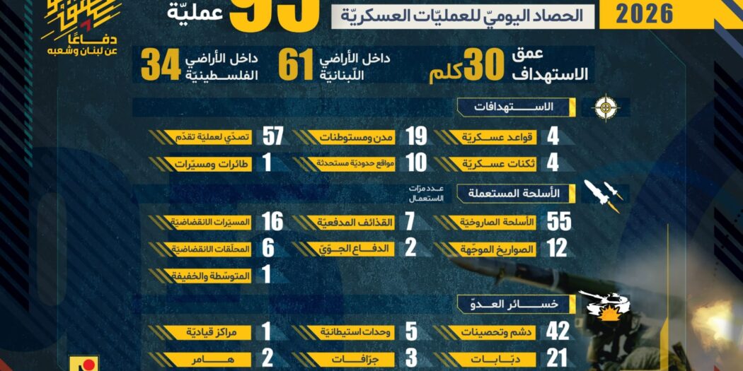 الحصاد اليومي لعمليات المقاومة الإسلامية بتاريخ 25-03-2026 المقاومة الاسلامية نفذت يوم امس 95 عملية نُشِرت في 87 بيان