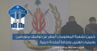 صدر عن المديريّة العامّة لقوى الأمن الدّاخلي – شعبة العلاقات العامّة البلاغ التّالي: في إطار المتابعة المستمرّة التي تقوم بها قوى الأمن الدّاخلي لمكافحة الجرائم في مختلف المناطق اللبنانية، ومتابعةً لعمليّات تهريب الأسلحة والذّخائر من سوريا إلى لبنان، توافرت معطيات لدى شعبة المعلومات حول نشاط أشخاص مجهولي الهويّة بتهريب …