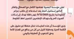 بسم الله الرحمن الرحيم مؤسسة البصيرة الثقافية التوعوية – صنعاء *تعلن مؤسسة البصيرة تضامنها الكامل مع الصحافي والمفكر الدكتور إسماعيل النجار بعد استدعائه إلى مكتب جرائم المعلوماتية بتاريخ 9/12/2025 بتهم باطلة تهدف إلى إسكات الصوت الحر واستهداف الإعلاميين المنتمين لخط المقاومة.* وترى المؤسسة أن هذه الممارسات تمثل ضغطًا …