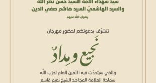 يُلقي *الأمين العام لحزب الله حجة الإسلام والمسلمين سماحة الشيخ نعيم قاسم* كلمة خلال المهرجان الذي يقيمه حزب الله *”نَجيع ومِدادٌ”* تعظيمًا للعلماء الشهداء على طريق القدس وأولي البأس، وتكريمًا لمن جمعوا سموّ العلم ومجد الشهادة من العلماء الشهداء الذين اكتمل نورهم بشهادة الأمينين العامين لحزب الله، *سيد شهداء الأمة …