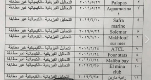 انتشرت صورة عبر مواقع التواصل الإجتماعي لورقة عليها ختم وزارة الداخلية والبلديات تتضمن أسماء مسابح ومنتجعات في محافظة جبل لبنان غير مطابقة للمواصفات. واللافت في الصورة وجود منتجعات سياحية كبيرة ومشهورة. ويبدو ان العينات التي أخذت من هذه المسابح تعود لشهري أيار وحزيران.