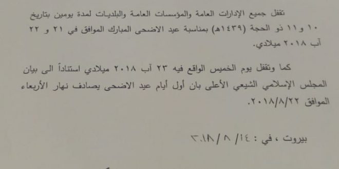 مذكرة بالاقفال في 21 و22 و23 آب لمناسبة عيد الاضحى