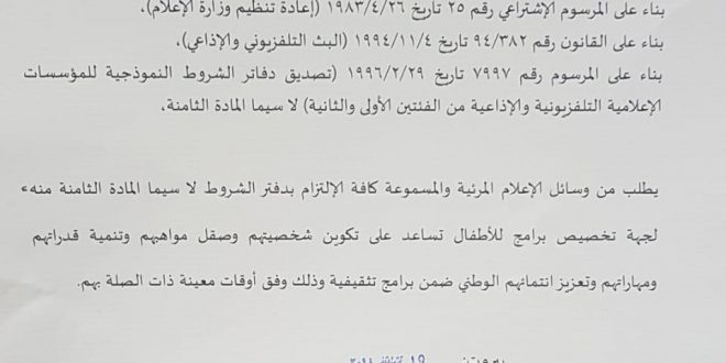 *♨♨♨تعميم صادر عن معالي وزير الاعلام الى كافة الوسائل الاعلامية يتعلق بالزامية انتاج وبث برامج تثقيفية توجيهية للاطفال .*