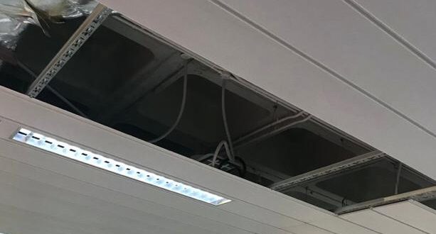 وظهرت الأسلاك والإمدادات الداخلية للسقف.