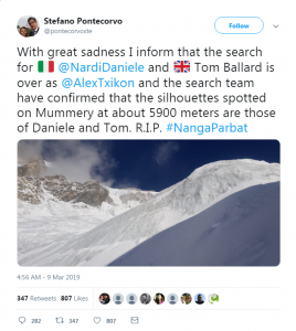 وكتب السفير الإيطالي ستيفانو بونتيكورفو على تويتر “بحزن بالغ أعلن انتهاء البحث عن دانيلي ناردي وتوم بالارد لأن… فريق البحث أكد أن الظلين اللذين رصدا على (طريق) ماميري، على ارتفاع 5900 متر تقريبا، هما لدانيلي وتوم. ارقدا في سلام“.