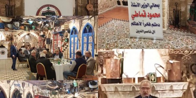 اقامت جامعة ال نصر الدين حفل غداء تكريمي على شرف وزير الدولة لشؤون مجلس النواب الحاج محمود قماطي في مطعم وفندق الساحة والقى كل من رئيس المحاكم الدرزية الشيخ فيصل ناصر الدين والمحامي سعيد نصر الدين كلمة كما القى كلمة ترحيبية رئيس الجامعة المهندس خليل ناصر الدين رحب بالحضور والضيف بعد ذلك القى المحتفى به الوزير قماطي حيث تحدث عن عادات المميزة للعشائر والعوائل ووقوفهم الى جانب الحق ووصف العشائر بالتواضع وبالتضحيات