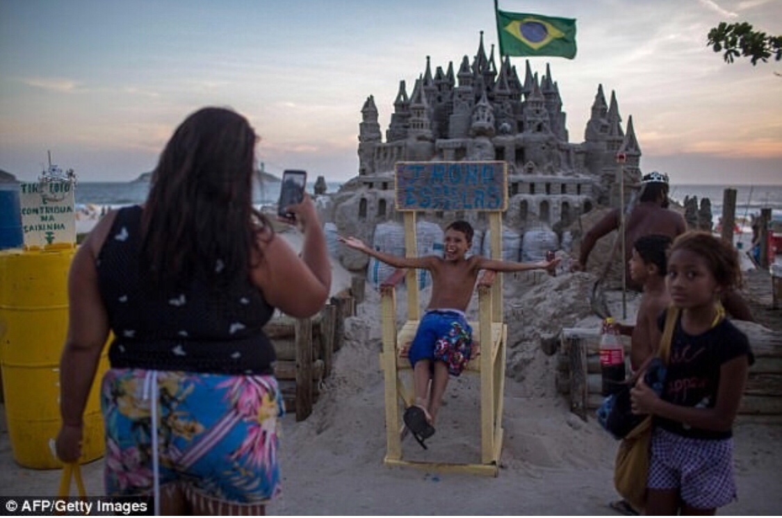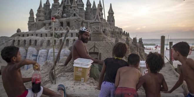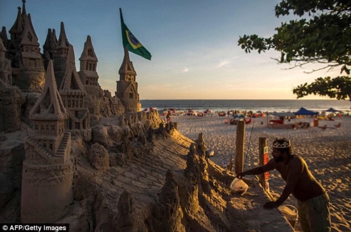 مع تاج على الرأس، ينكب مارسيو ميزايل ماتيولاس على إصلاح قصره رغم الحرارة التي تلامس مستوى أربعين درجة مئوية على شاطئ ريو دي جانيرو في هذا اليوم من كانون الثاني، فهذا البرازيلي الأربعيني يعيش منذ أكثر من عقدين في قصر من الرمل.