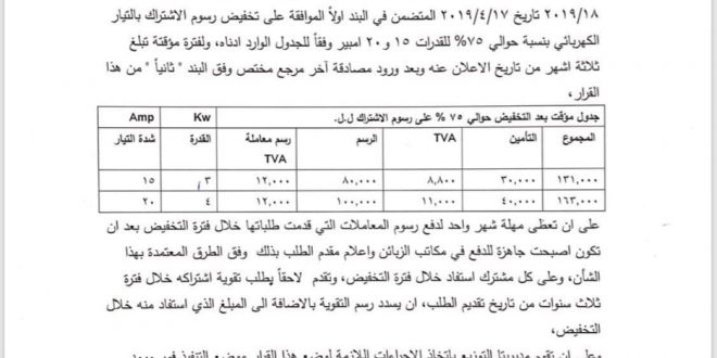 أعلنت وزيرة الطاقة والمياه ندى بستاني عن “تخفيض مؤقت على رسوم الإشتراك بالتيار الكهربائي للقدرات المكتتبة 15 و 20 أمبير ولفترة محدودة”.