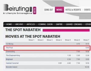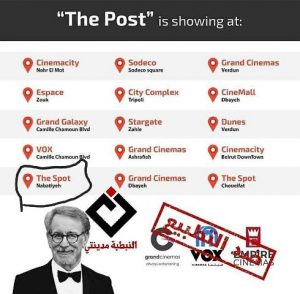 بالرغم من الجدل القائم حول عرض فيلم فيلم The Post للمخرج الأميركي ستيفن سبيلبرغ في صالات السينما في لبنان حيث ان لجنة الرقابة في الأمن العام منعت عرض فيلم The Post لسببين، أولهما أن الفيلم موجود على القائمة السوداء للجنة “المقاطعة العربية لإسرائيل” التابعة لجامعة الدول العربية، وضرورة أن يدقق أي فيلم في اللجنة بحسب الاتفاقيات بين لبنان والجامعة العربية.