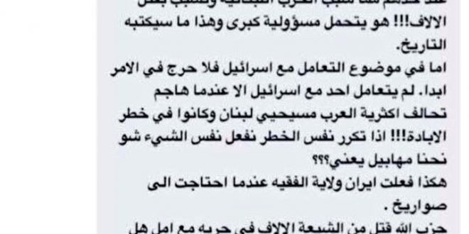 “اما في موضوع التعامل مع اسرائيل فلا حرج في الامر ابداً لم يتعامل احد مع اسرائيل الا عندما هاجم تحالف اكثرية العرب مسيحيي لبنان وكانوا فقي خطر الابادة !! اذا تكرر نفس الخطر نفعل نفس الشيئ شو نحنا مهابيل يعني ؟؟؟”
