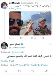 في خطوة استفزازية وللمرة الثانية افيخاي ادرعي يستفز الزميل علي مرتضى ويغرد على تويتر ويوجه الاتهامات واللوم على حزب الله. والافت ان ما يزعج افيخاي ادرعي هو عدم رد الزميل علي مرتضى على اي من تغريدات افيخاي