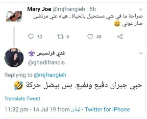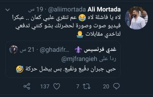 تجاذبات جديد بين الزميل علي مرتضى و غدي فرنسيس المستفزه لعلي مجددا والواضح انها ( مقروصه) منه ولم توفر مناسبه او ريتويت الا وتلاحقه بها فما كان من علي مرتضى الا ان استوعبها وطلب ديو عله ينشهر باسلوبها