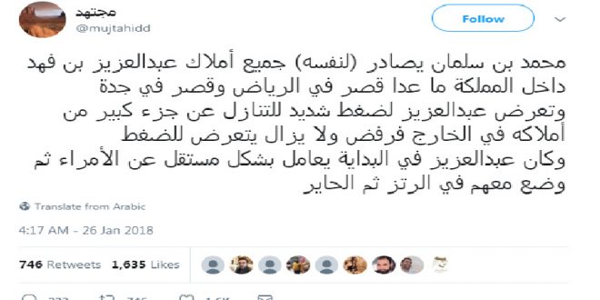وقال “مجتهد” في تغريدة عبر حسابه على موقع التواصل الاجتماعي “تويتر” الجمعة، إن “محمد بن سلمان صادر (لنفسه) جميع أملاك عبدالعزيز بن فهد داخل المملكة، ما عدا قصرا في الرياض، وقصرا في جدة.”