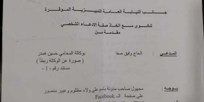 و”عبير منصور” على الفايسبوك بجرم إختلاق جرائم والإفتراء والقدح والذم بعد نشر منشوراً على الفايسبوك يتضمن تلفيق تهم وإدعاءات باطلة بحق الحاج وفيق صفا.
