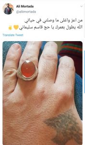 نشر الأعلامي علي مرتضى على حساباته الخاصة على منصات التواصل الأجتماعي صورة ليده يرتدي فيها خاتم تحت عنوان “من اعز واغلى ما وصلني في حياتي ﷲ يطول بعمرك يا حاج قاسم سليماني”
