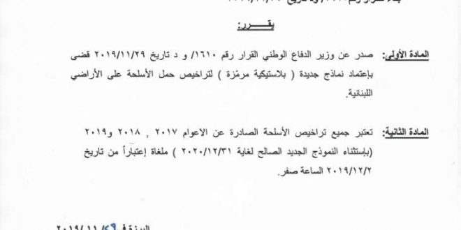 أعلن وزير الدفاع في حكومة تصريف الأعمال الياس بو صعب في قرار، إلغاء جميع تراخيص الأسلحة السابقة، واعتماد نماذج جديدة بلاستيكية مرمزة على كافة الأراضي اللبنانية.
