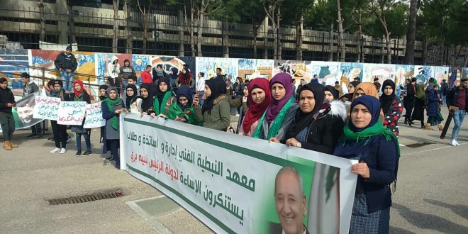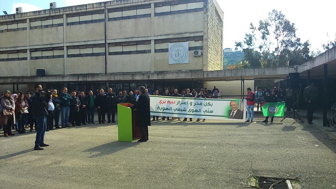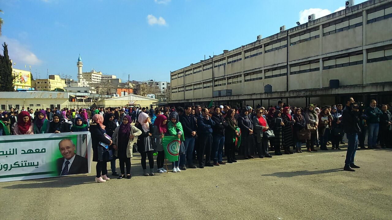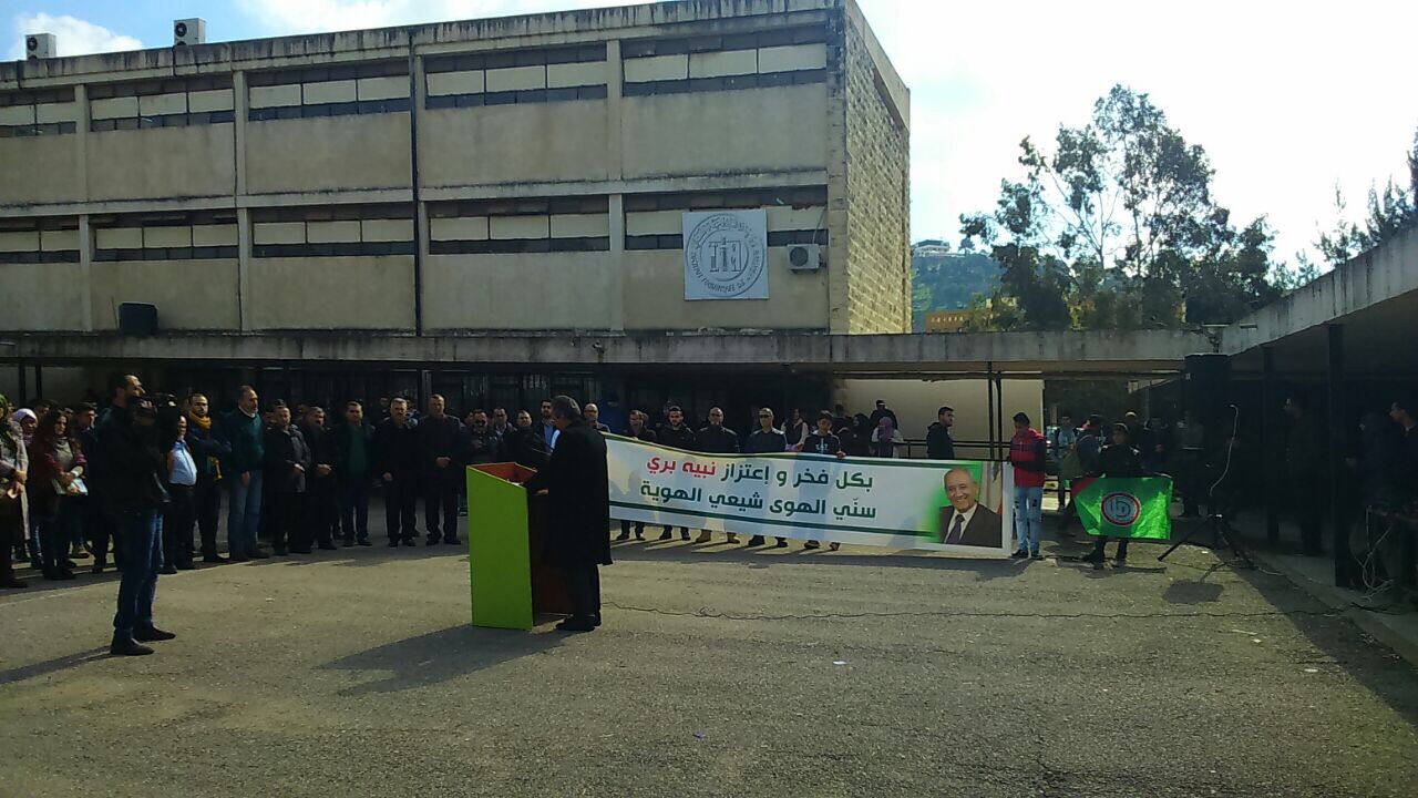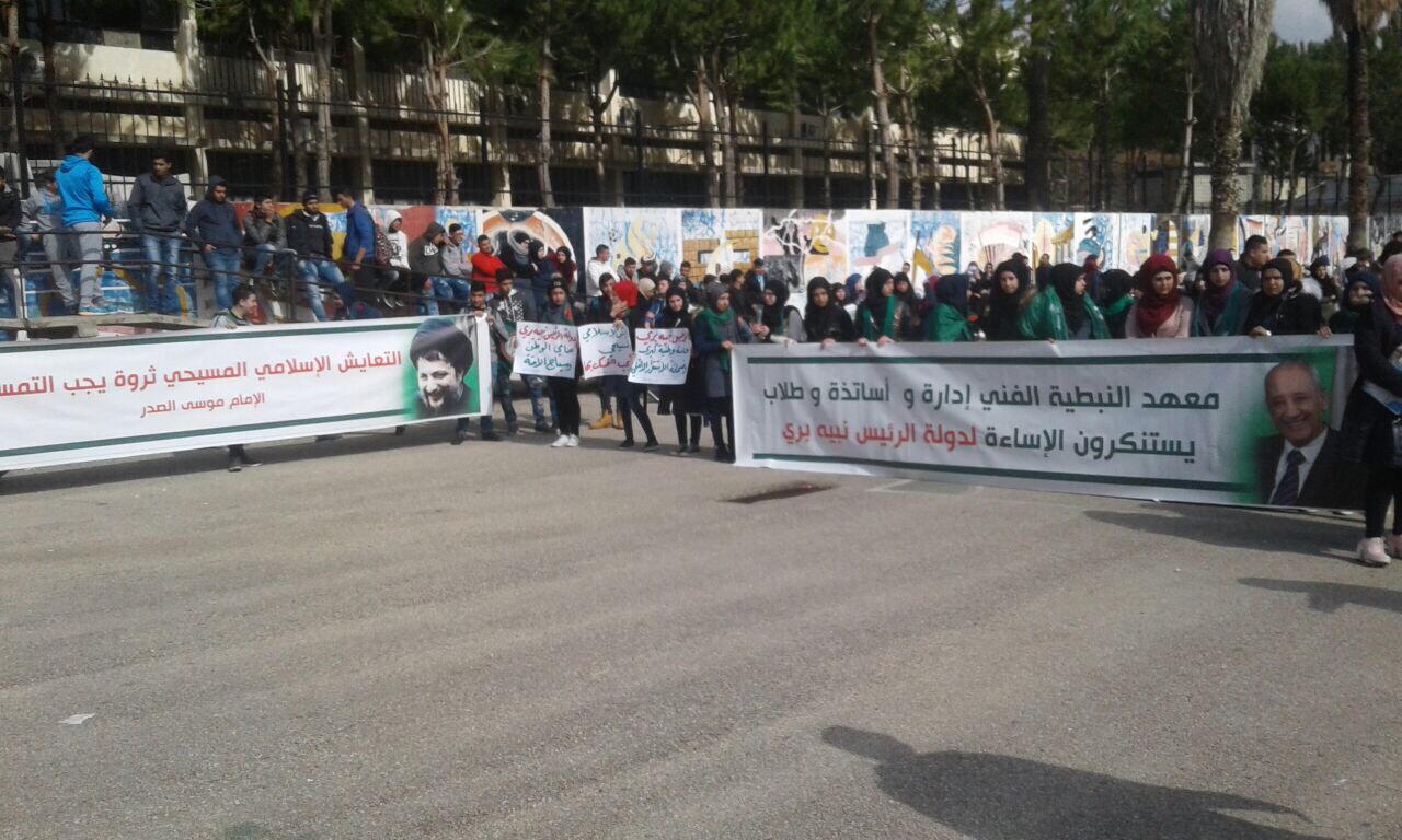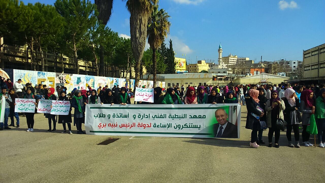 بدعوة من حركة أمل شعبة معهد النبطيه الفني أقيم وقفة تضامنيه استنكارا للإساءه التي تعرض لها رئيس حركة امل رئيس مجلس النواب الأستاذ نبيه بري و تنديدا بما صدر بحقه و قد حضر الاحتفال الهيأتين الاداريه و التعليميه في المعهد و مسؤول قسم المعاهد و المهنيات في اقليم الجنوب الاخ فضل شعيب و حشد كبير من الطلاب
