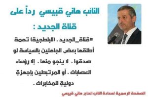 ولم تمضِ سوى دقائق حتى غرد عضو كتلة التنمية والتحرير النائب هاني قبيسي عبر حسابه على موقع “تويتر” تغريدة رد فيها على كلام الخياط قائلاً #قناة_الجديد ،،(البلطجية) تهمة أطلقها بعض الجاهلين بالسياسة لو صدقوا، لا ينجو منها، إلا رؤساء العصابات ، أو المرتبطين بإجهزةٍ دوليةٍ للمخابرات