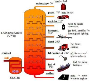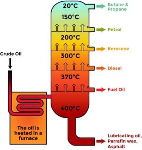 يعني يُصار إلى تبخير النفط ومن ثم تقطيره فينتج عن تلك العملية عدة أنواع من الوقود وهي بالترتيب من الأخف وزنًا إلى الأثقل وزنًا
