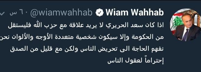 وقال وهاب في تغريدة له على صفحته على موقع “تويتر”: “اذا كان سعد الحريري لا يريد علاقة مع حزب الله فليستقل من الحكومة وإلا سيكون شخصية متعددة الأوجه والألوان نحن نفهم الحاجة الى تحريض الناس ولكن مع قليل من الصدق إحتراماً لعقول الناس