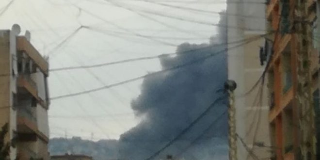 دخان كثيف في سماء بعبدا نتيجة حريق في مستودعات زيت مازولا بمنطقة المكلس.