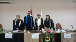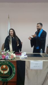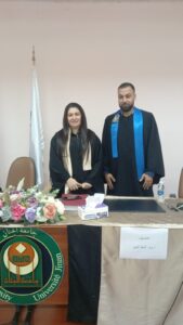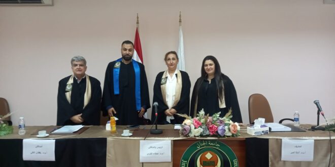 وتألفت لجنة المناقشة من الدكتورة صفاء الكردي رئيسة ومناقشة، والدكتورة آمنة المير مشرفة، والدكتور يقظان التقي مناقشاً