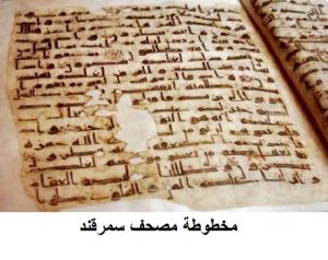 أيضا توجد مخطوطة في سمرقند (ثاني أكبر مدن جمهورية) أوزباكستان مصحف (سمرقند الكوفي)، والمخطوطة مكتوبة بالخط الكوفي وموجودة في مكتبة (هاست إمام)، في العاصمة الأوزبكية (طشقند) وهي في رأي البعض، أقدم المصاحف المخطوطة في العالم ويعود إلي القرن التاسع للميلاد. بيد أنها مخطوطة منقوصة نوعاً ما، فلم يتبق فيها إلا ثلث القرآن. وهي تبدأ من منتصف الآية السابعة من سورة البقرة وتنتهي في سورة الزخرف. كما إنها تحتوي على 8 إلى 12 سطراً في كل صفحة، وهي خالية من علامات التنقيط لذلك فهي قديمة للغاية.
