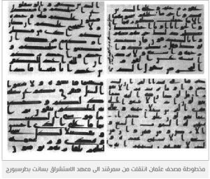 أيضا في عام 2002، وخلال مؤتمر دولي مكرّس لدراسة الآثار النثرية لشعوب الشرق الاوسط عرض في المكتبة الوطنية الفرنسية، فيلم وثائقي بعنوان (في البحث عن مصحف عثمان)، ويسرد دراسة لأحد اقدم مخطوطات القرآن التي تحفظ في سانت بطرسورغ في معهد الاستشراق باكاديمية العلوم الروسية، والمخطوطة يعود تاريخها الى الفترة المسماة بفترة حفظة القرآن، ويرجح بعض الباحثين أنها كانت ملك للديبلوماسي البارز في روسيا القيصرية (ايرني سليم نوفل) اللبناني الاصل.
