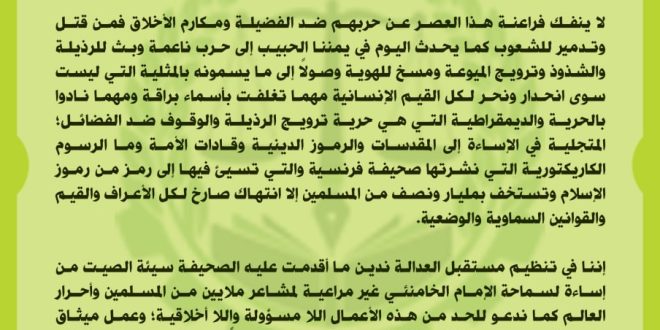 إننا في تنظيم مستقبل العدالة ندين ما أقدمت عليه الصحيفة سيئة الصيت من إساءة لسماحة الإمام الخامنئي غير مراعية لمشاعر ملايين من المسلمين وأحرار العالم كما ندعو للحد من هذه الأعمال اللا مسؤولة واللا أخلاقية؛ وعمل ميثاق شرف أممي يردع مثل هذه الأعمال التي بلغت حداً لا يطاق حيث تهدف إلى الاستخفاف بالأنبياء والمرجعيات الدينية والفكرية وسقوط منظومة القيم التي هي إرث إنساني لجميع البشر.