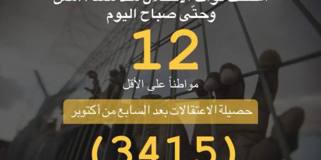 وبذلك ترتفع حصيلة الاعتقالات بعد السابع من أكتوبر المنصرم، إلى أكثر من (3415)، وهذه الحصيلة تشمل من جرى اعتقالهم من المنازل، وعبر الحواجز العسكرية، ومن اضطروا لتسليم أنفسهم تحت الضغط، ومن احتجزوا كرهائن.