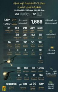 في 23 أيلول 2024، شن العدو عدوانًا جويًا واسعًا على جنوب لبنان والبقاع، مما تسبب بتهجير أهل القرى الجنوبية، وبلغت حصيلة ذلك اليوم 492 شهيدًا و1645 جريحًا. في 25 أيلول 2024، قصفت المقاومة عددًا من الأهداف الإسرائيلية، وهي: قاعدة دادو، مخازن لوجستية، مطار مجيدو العسكري، ومصنع زخرون للمتفجرات.