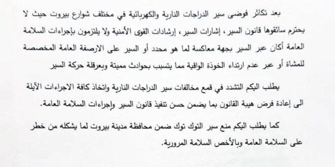 *طلب محافظ بيروت من شرطة بيروت في قوى الأمن الداخلي التّشدد في قمع مخالفات سير الدراجات الناريّة و منع سير التوك توك في مدينة بيروت.* خبر عاجل, محلية شاركها Facebook Twitter