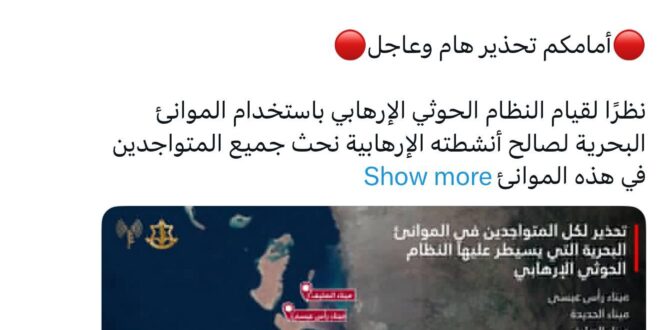 جـيـش الـعـدو الـصـهـيـونـي أعرف عدوك, عربية شاركها Facebook Twitter يوجه تحذيرا لميناء رأس عيسى، ميناء الحديدة، وميناء الصليف في اليمن تمهيدًا لشن عدوان