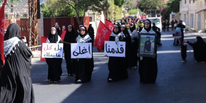 وتقدم المسيرة الفرق الكشفية وحملة الرايات والصور والمجسمات، ومواكب اللطم، حيث صدحت الحناجر باللطميات الحسينية والشعارات الزينبية وهتافات المقاومة، فيما ضاقت الشوارع بالحشود من المشاركين مرتدين اللباس الأسود، ورافعين الأعلام الحسينية ورايات حزب الله وصور الشهداء القادة.