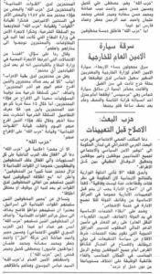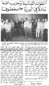 وجاء فيه: “تبودل قبل ظهر أمس (18 تموز 1991)، في مبنى وزارة الدفاع الوطني في اليرزة، 13 مخطوفا بين القوات اللبنانية وحزب الله وبعضهم أمضى اربع سنوات بعيدا عن أهله. وحصل التبادل في مكتب نائب رئيس مجلس الوزراء وزير الدفاع الوطني المهندس ميشال المر وفي حضوره وحضور مدير المخابرات في الجيش العقيد خليل جلبوط ومدير العلاقات العامة والاعلام في وزارة الدفاع السيد ميلاد القارح وممثل حزب الله الحاج وفيق صفا”.