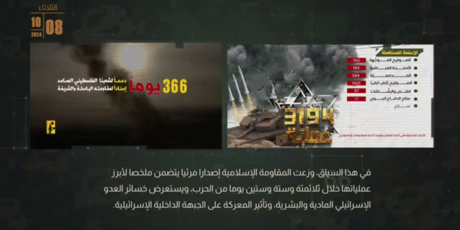 في هذا السِّياقِ، وزَّعت المقاومةُ الإسلاميَّةُ إصدارًا مرئيًّا يتضمَّن ملخَّصًا لأبرزِ عمليَّاتِها خلالَ ثلاثِمئةٍ وستَّةٍ وستِّينَ يومًا من الحربِ، ويستعرضُ خسائرَ العدوِّ الإسرائيليِّ الماديَّةَ والبشريَّةَ، وتأثيرَ المعركةِ على الجبهةِ الداخليَّةِ الإسرائيليَّةِ.