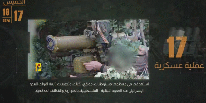 في إطارِ الرَّدِّ على العدوانِ الإسرائيليِّ، ودفاعًا عن لبنانَ وشعبِه، نفَّذت المقاومةُ الإسلاميّةُ، يومَ الخميس الواقعِ فيه السابعَ عشرَ من تشرينَ الأوّل 2024، سبعَ عشْرةَ عمليّةً عسكريّةً، استهدفت في معظمِها مستوطناتٍ، مواقعَ، ثكناتٍ، وتجمّعاتٍ تابعةً لقوّاتِ العدوِّ الإسرائيليِّ عندَ الحدودِ اللبنانيّة – الفلسطينيّة، بالصواريخِ والقذائفِ المدفعيّة.
