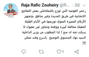 ” رخص الفوميه التي توزع بالجملة على بعض المفاتيح الانتخابية في طريق الجديدة وغير مناطق ،وتجهيز الأرقام المميزة المنوي توزيعها في الأيام القليلة المقبلة مخالفة كبيرة ووقحة وتجاوز غير مقبول لا يسكت عنه ان صح ! لذا المطلوب من وزير الداخلية السيد نهاد المشنوق التوضيح بأسرع وقت ممكن !!! ”