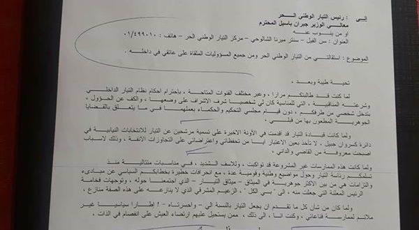 وأوضح الهاشم بحسب الكتاب، اسباب استقالته، فربطتها “بعدم احترام احكام النظام الداخلي في التيار وشرعته المناقبية التي شارك شخصيا في وضعها، وتسمية مرشحين عن التيار في دائرة كسروان جبيل من دون الاخذ بتحفظاته، وانحرافات في خطاب باسيل عن ميثاق التيار الوطني الحر