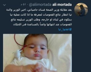 نشر الاعلامي علي مرتضى عبر حسابه في فايسبوك و تويتر ان وزير الصحة غسان حاصباني وعد بمتابعة حالة تيا وتقديم ما يستطيع من مساعدة لها، وفي التفاصيل قال مرتضى: “بعد مقابلة وزير الصحة غسان حاصباني، اخبر الوزير والدة تيا انتظار نتائج الفحوصات لمعرفة ما اذا كانت عملية تيا ستكون في لبنان او خارجه، وطلب الوزير تسليمه نتائج الفحوصات عند انتهائها واعداً بالمساعدة قدر الامكان” مرفقاُ المنشور بهاشتاغ #انقذوا_تيا