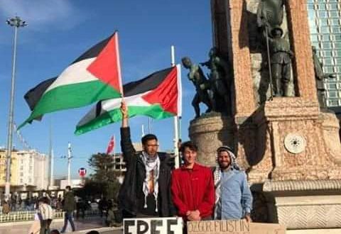 الرحالة السويدي "بنجامين لادرا" يعتصم تضامنا مع فلسطين في اسطنبول التي وصلها في رحلة من السويد إلى فلسطين سيرا على الأقدام .