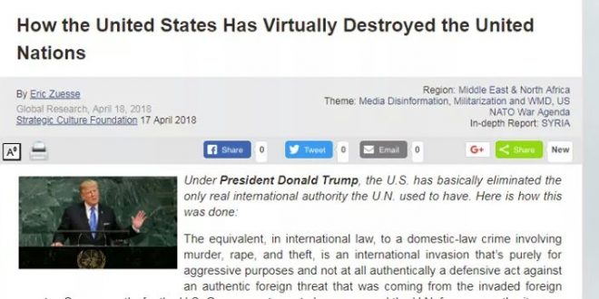 الوقت- قال موقع “غلوبال ريسيرش” الكندي في مقال بقلم الكاتب “اريك زويس” أنه وتحت حكم الرئيس دونالد ترامب ، ألغت الولايات المتحدة بشكل أساسي السلطة الدولية الحقيقية الوحيدة وهي هيئة الأمم المتحدة.