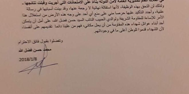 كتاب استقالة مقدم من محمد حسن فضل الله ابن النائب حسن فضل الله محلية شاركها Facebook Twitter كتاب استقالة مقدم من محمد حسن فضل الله ابن النائب حسن فضل الله