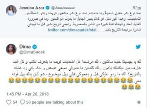 فما كان من ديما إلا ان ردت من جديد: “لك يا جيسيكا خلينا ساكتين ، لك مرشحة عَل انتخابات تويت ما بتعرف تكتب و كل البلد عارف مين بيكتبلك ياهون . لك كلمتين ما بتعرفي تصفي عبعض و بدك ياني رد عليك بالتاريخ؟ لك ما ردو عليكي قبل و بخعوكي قبلي بهل موضوع ، شو كان بدك بهل فوتة معي”
