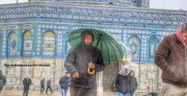 لتقيه من المطر داخل صحن الحرم القدسية الشريف، للدلالة على حداثة الصورة ضمن الاجواء المطرية التي كانت تسود القدس المحتلة في الايام القليلة الماضية.