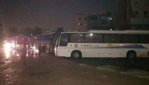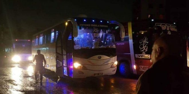 بالصور وصول الدفعة الأولى من الباصات التي ستقل الارهابيين من مخيم اليرموك إلى ادلب تنفيذاً للاتفاق الأخير .